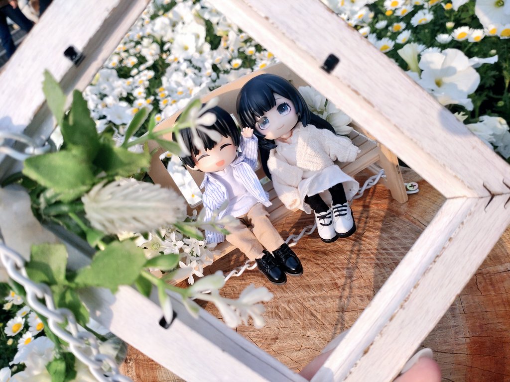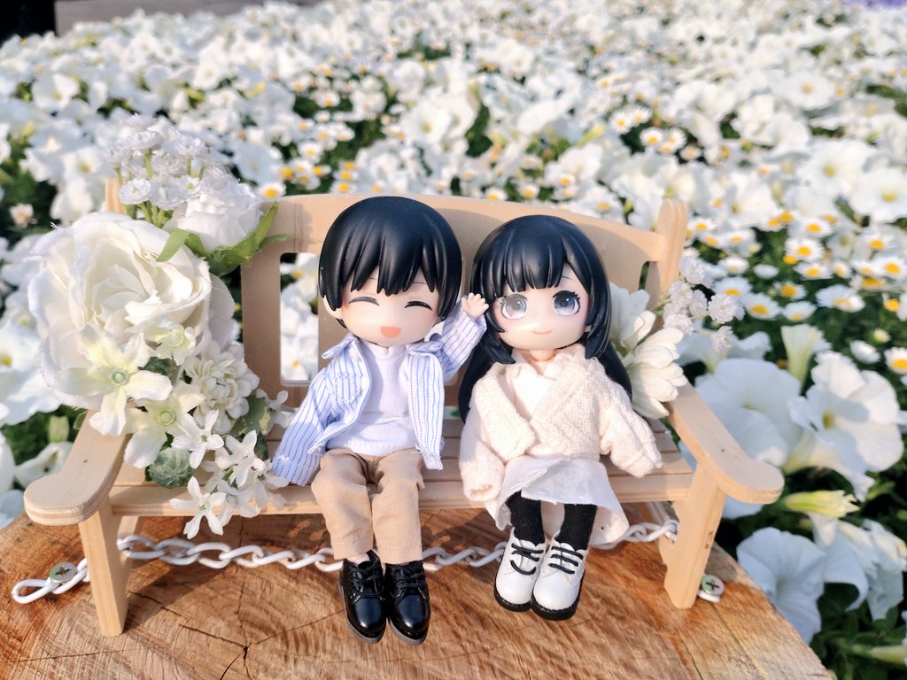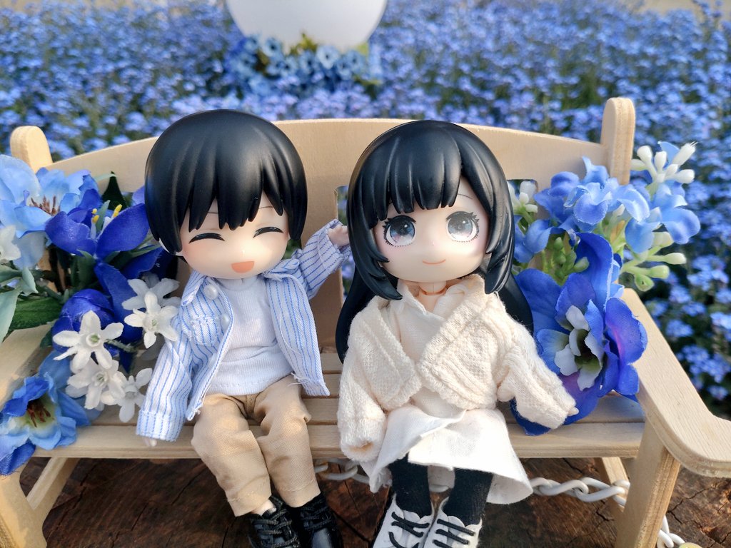 鮮やかなお花に感激して歩いていたところ、写真の通り推し活に特化させた家にも欲しいくらいのベンチがちょん……とさりげなく置かれており、三橋葵と是枝仰の創作ねんどろいどを座らせての写真がはかどりました。